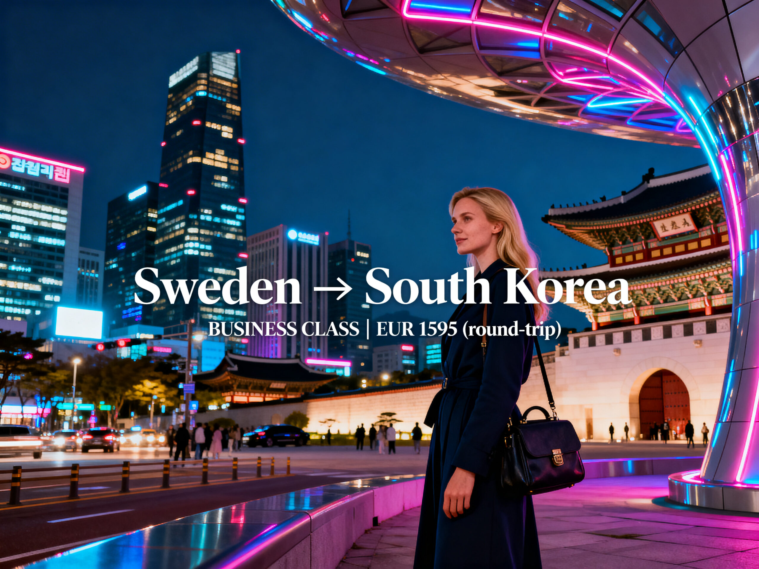We found cheap Business Class flights from Sweden to South Korea for just €1,595 (round-trip). (Regular fares usually cost between €2,800–5,500).