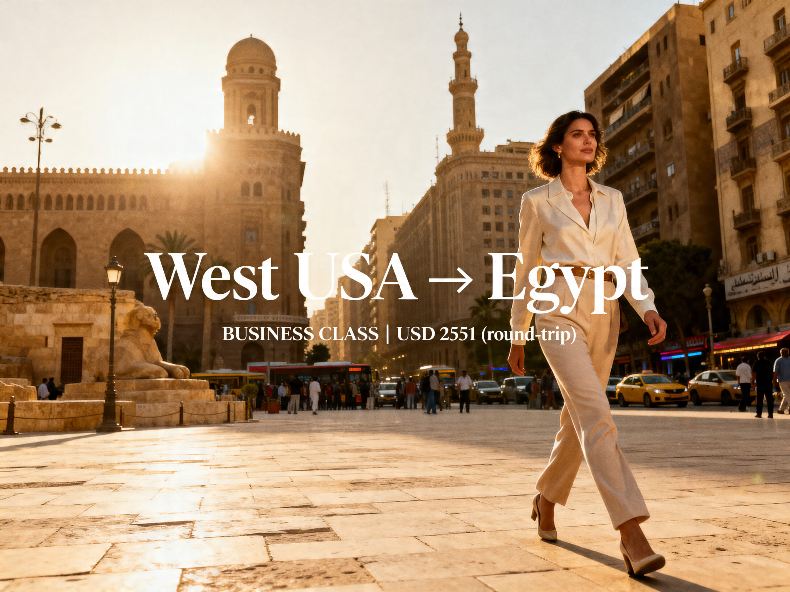 Fly from West Coast USA to Egypt in BUSINESS CLASS from only US$ 2,551 (round-trip)