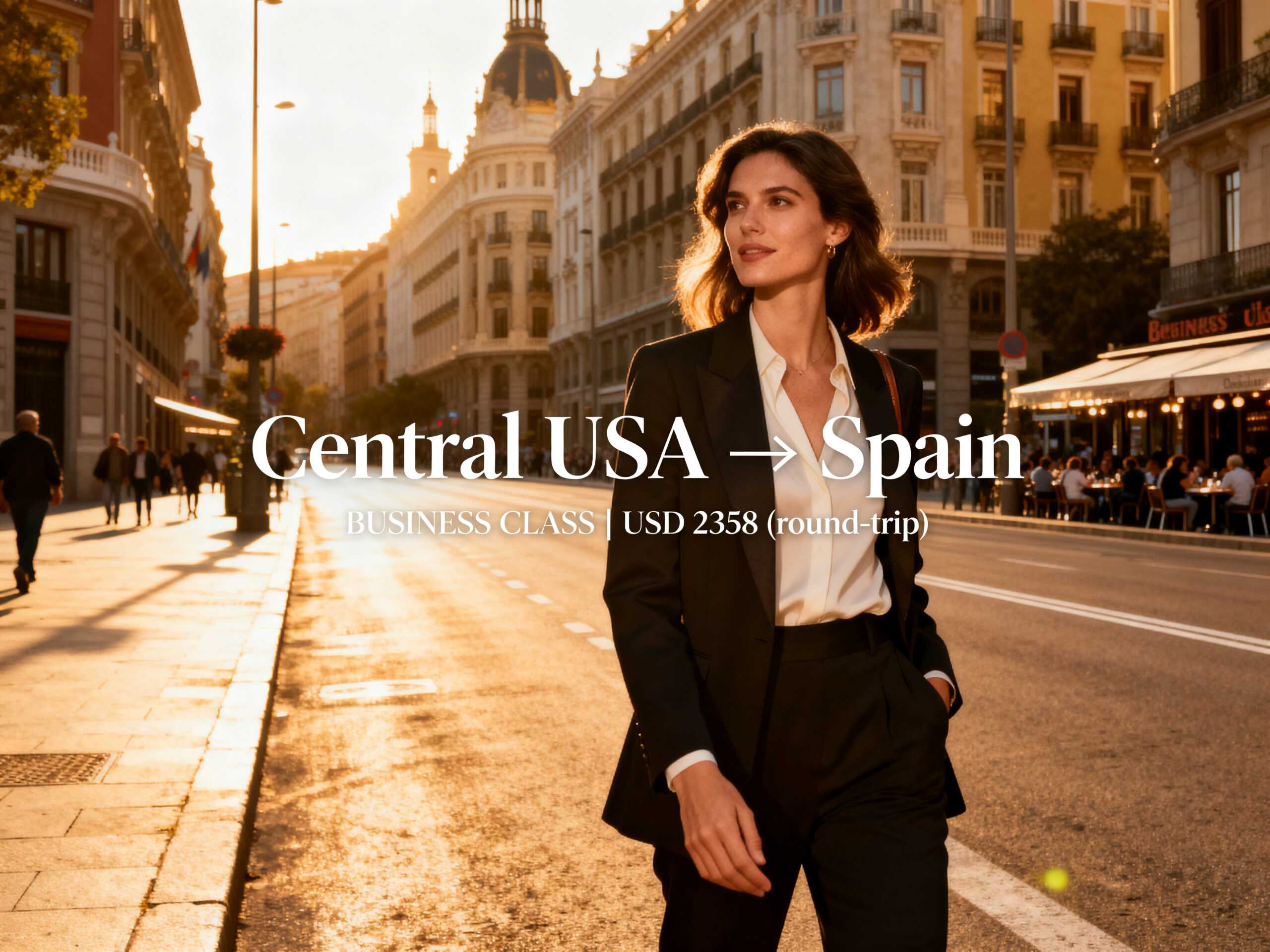 Fly in BUSINESS CLASS from Central USA to Spain from only US$ 2,358 (round-trip)