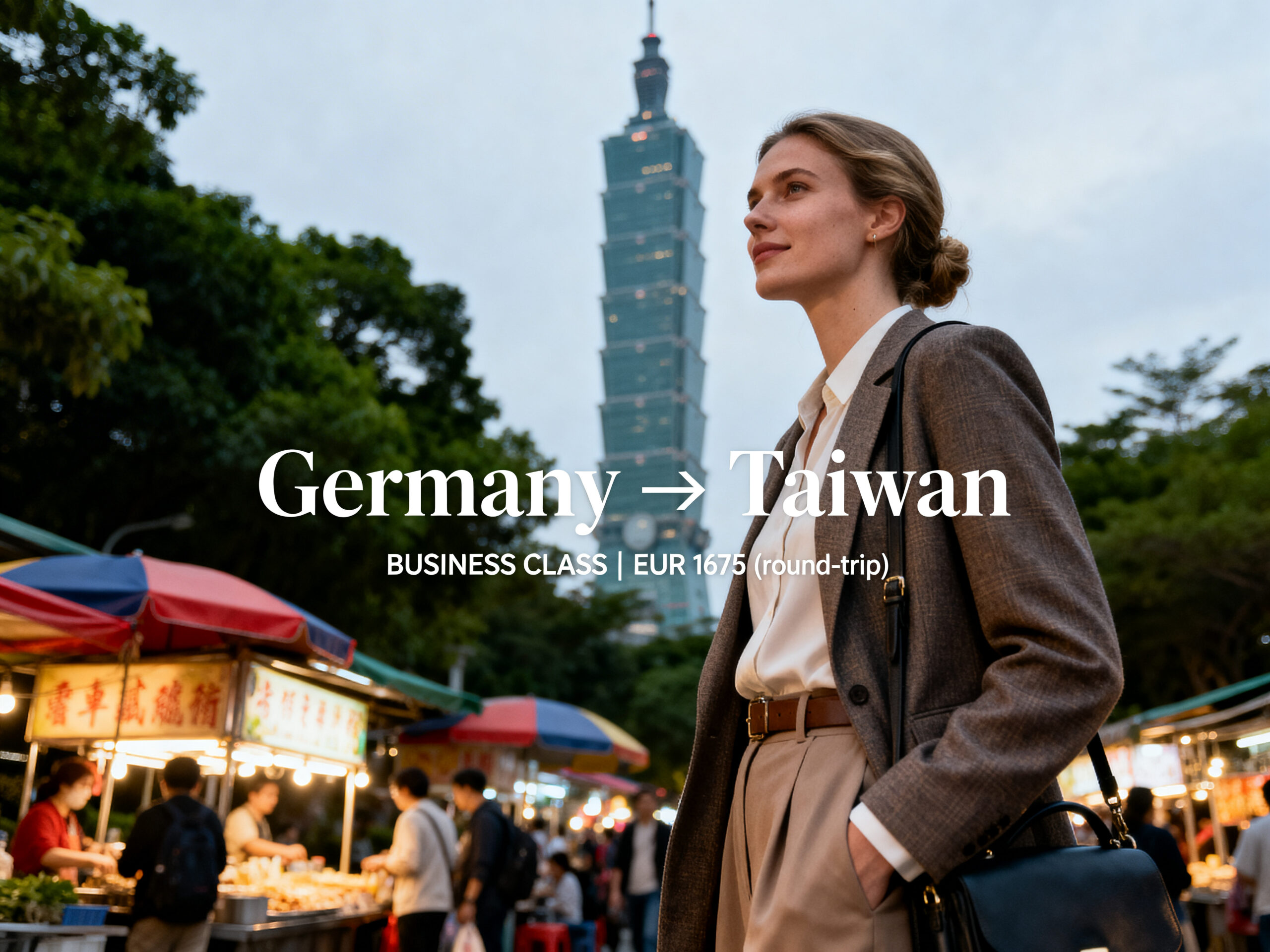 Currently you can book Business Class flights from Germany to Taiwan for just €1,675 (round trip).