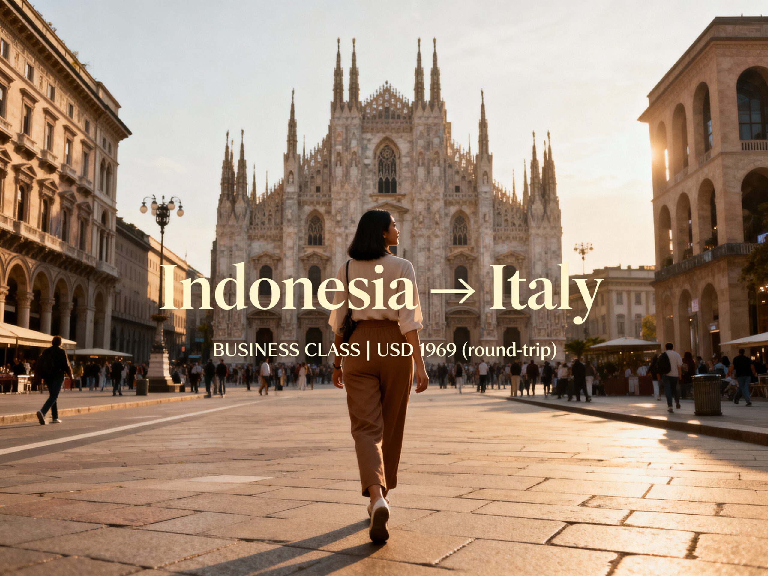 We found some cheap Business Class flights from Indonesia to Italy for just US$1,969 (round-trip).