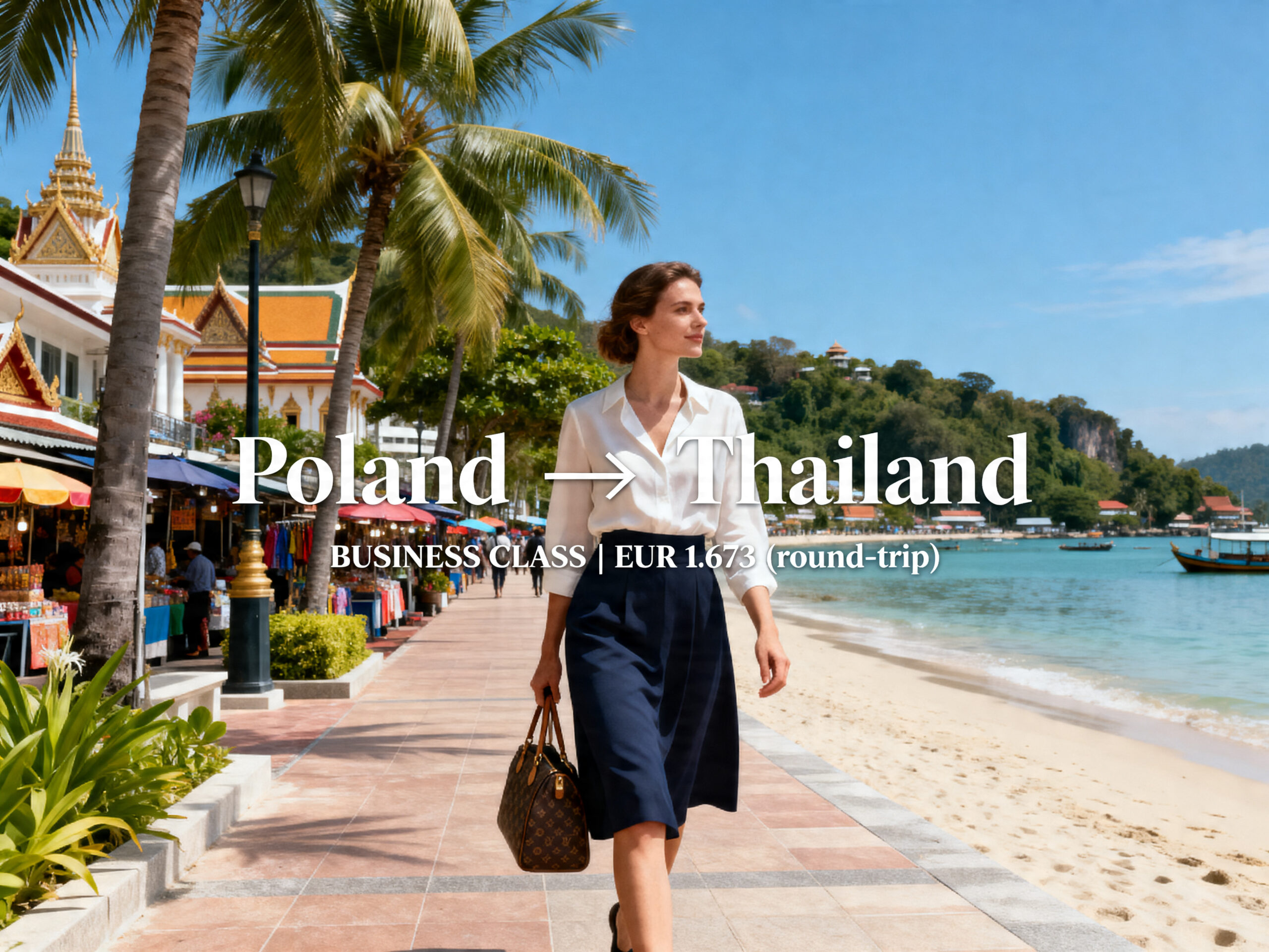 We’ve uncovered an awesome Business Class round-trip deal from Poland to Thailand for only €1,673, giving you the perfect excuse to explore Bangkok’s glittering temples and rooftop bars, unwind on Phuket’s turquoise beaches, island-hop through Krabi and Phi Phi, discover Chiang Mai’s lush mountains and night markets, and soak up the tropical magic of Koh Samui.