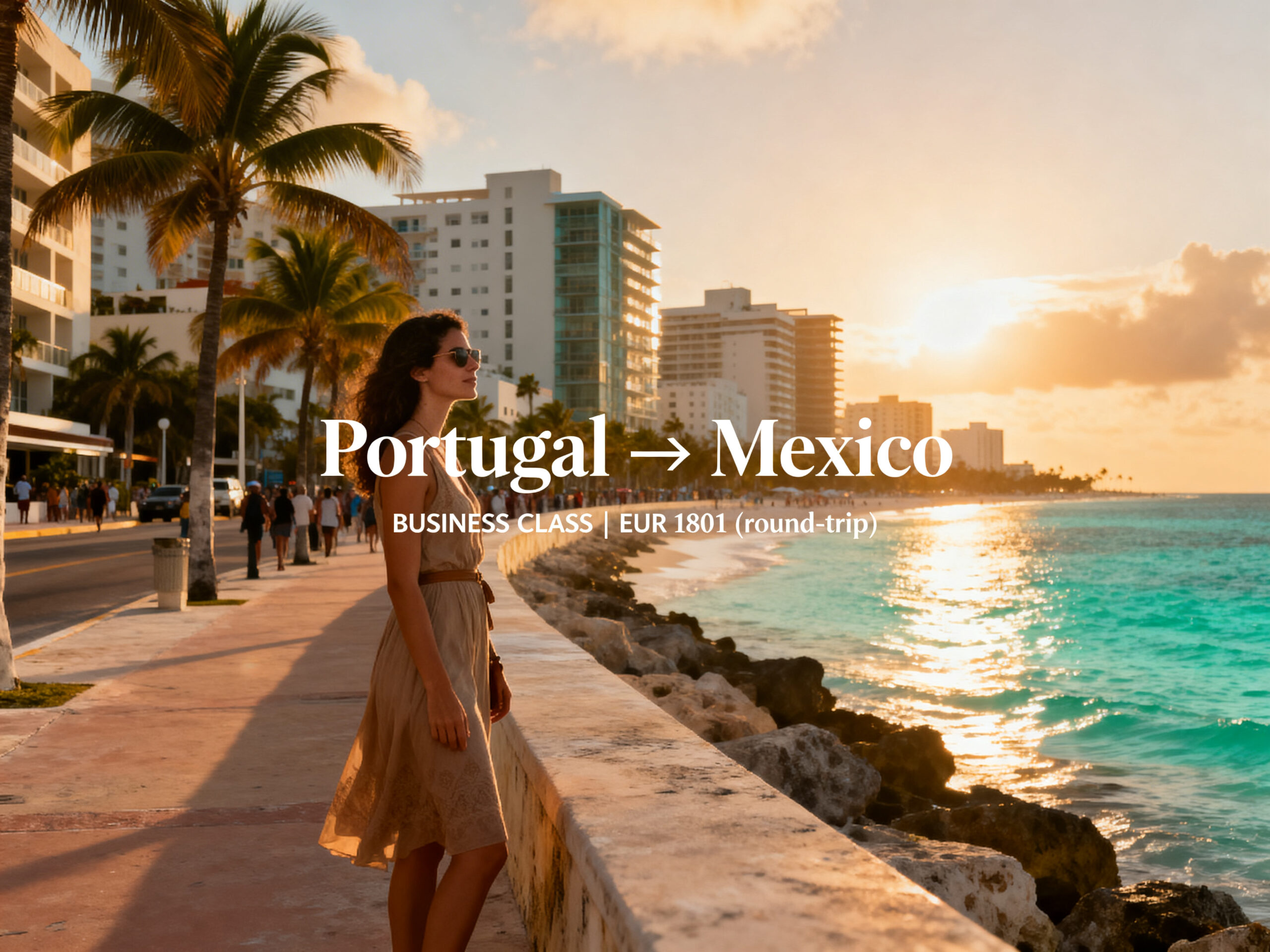 We’ve uncovered an incredible BUSINESS CLASS deal from Portugal to Cancun, Mexico for only €1,801 (round-trip) — saving you a massive 39% off the usual fare!