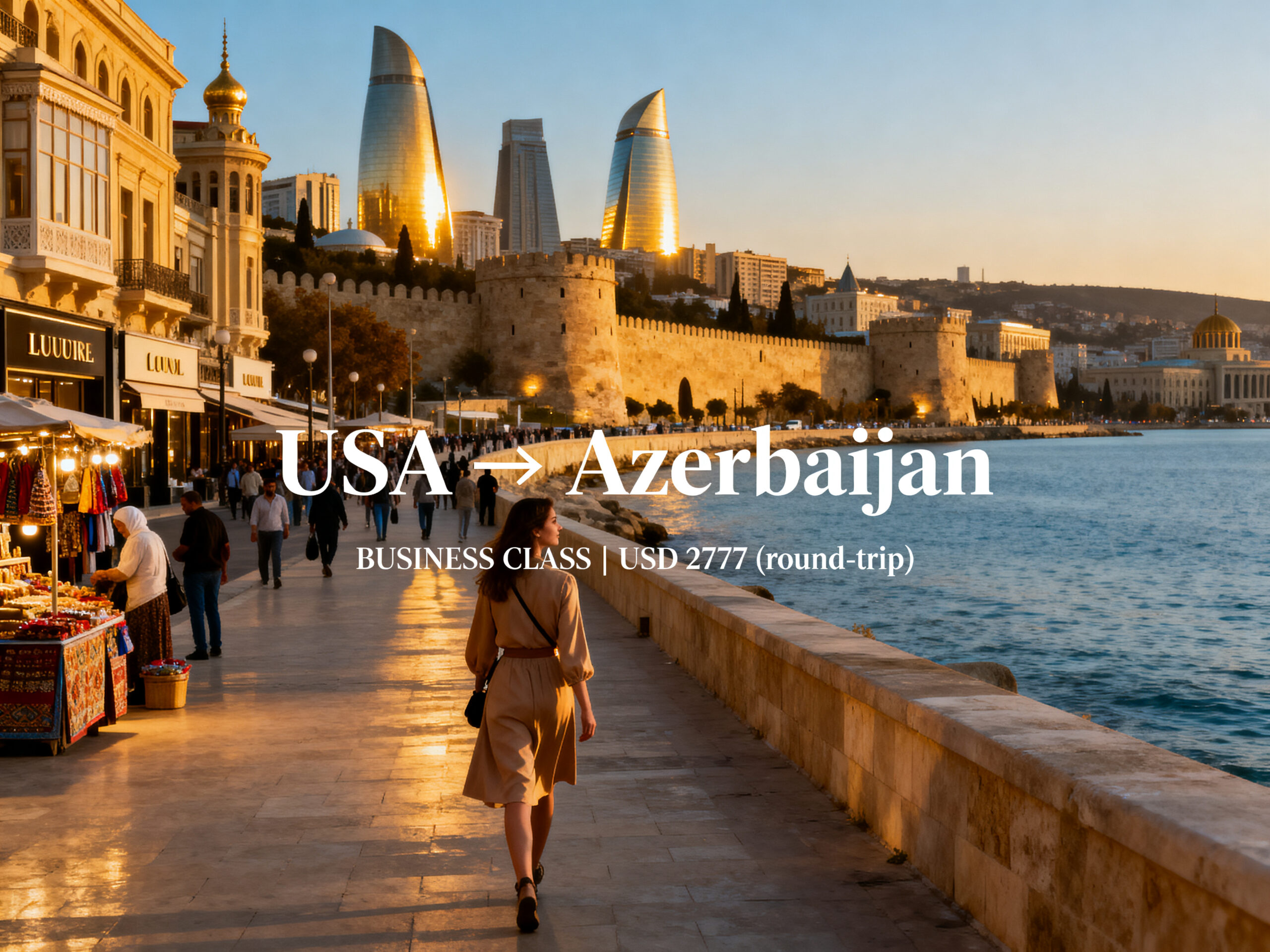 We found BUSINESS CLASS fares from USA to Azerbaijan starting from only US$ 2,777 (round-trip).