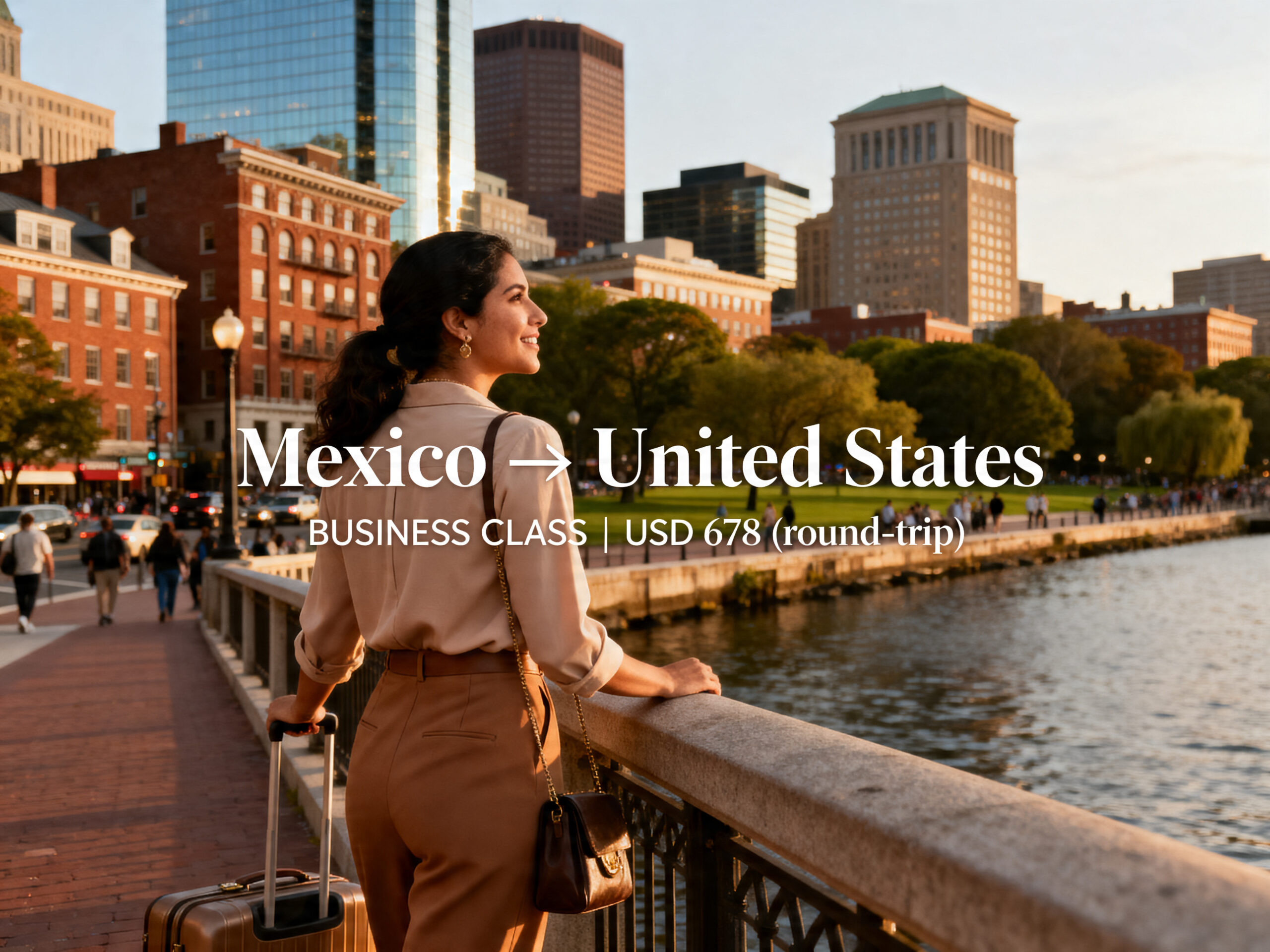 We found good BUSINESS CLASS fares from Mexico to Northern USA starting from only US$678 (round-trip), about 43% off the usual price!