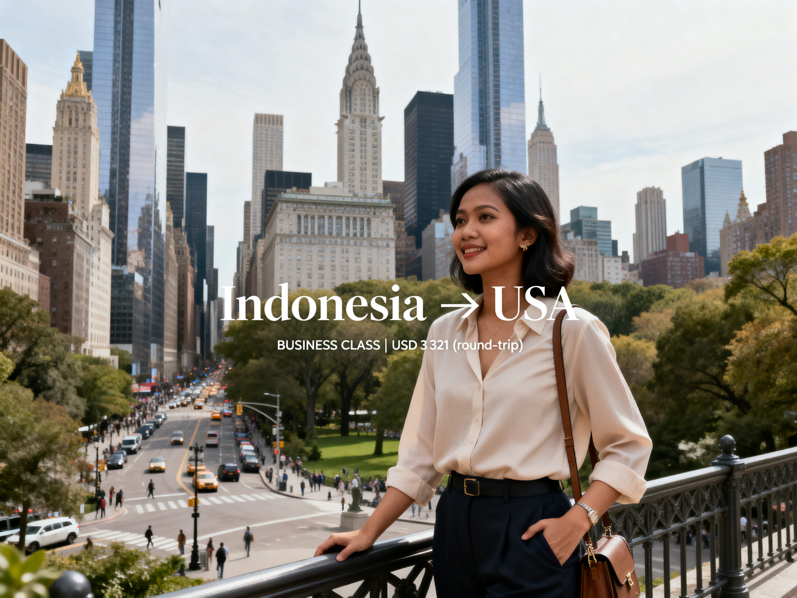 We found great BUSINESS CLASS fares for flights from Indonesia to USA from only USD $3,321 (round-trip).