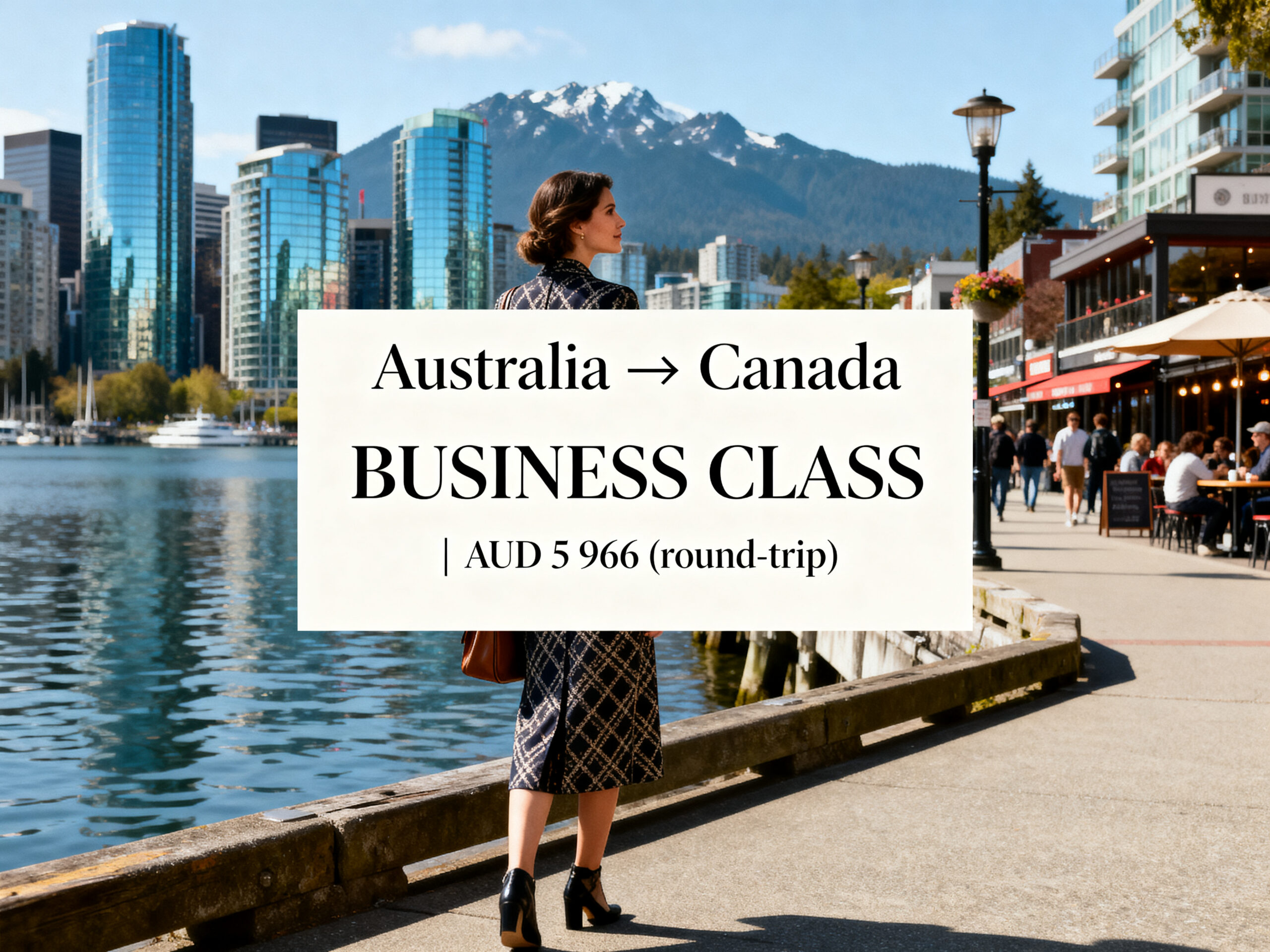 We found some cheap BUSINESS CLASS flights from Australia to Canada starting from only AU$ 5,966 (round-trip) with a top 5-star Airline.