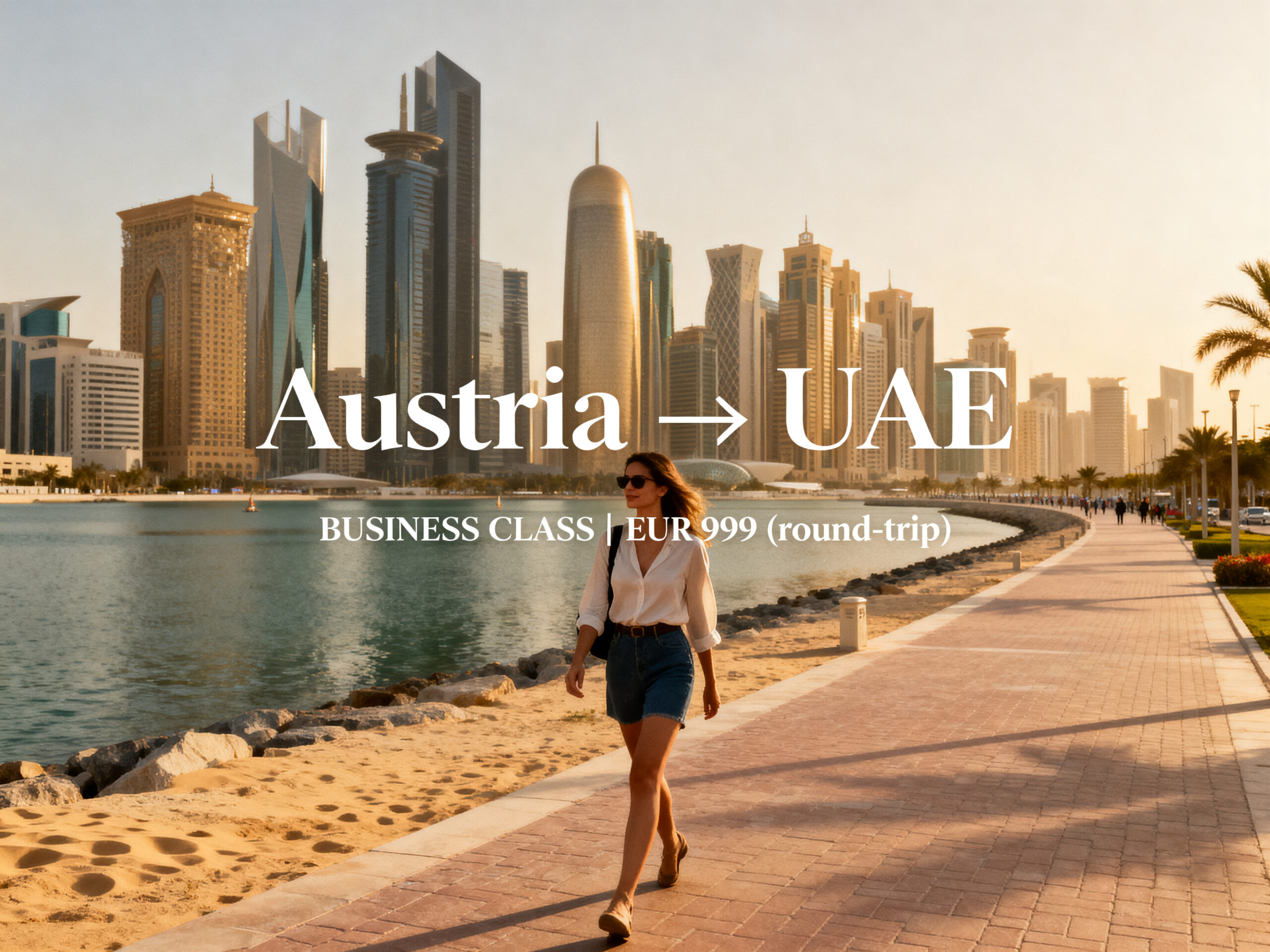 We’ve uncovered an incredible Business Class deal from Austria to the UAE for just €999 round-trip (46% OFF!) — unlock Dubai’s futuristic skyline, Abu Dhabi’s cultural landmarks, desert dune adventures, luxury beach resorts, and world-class shopping in total comfort and style