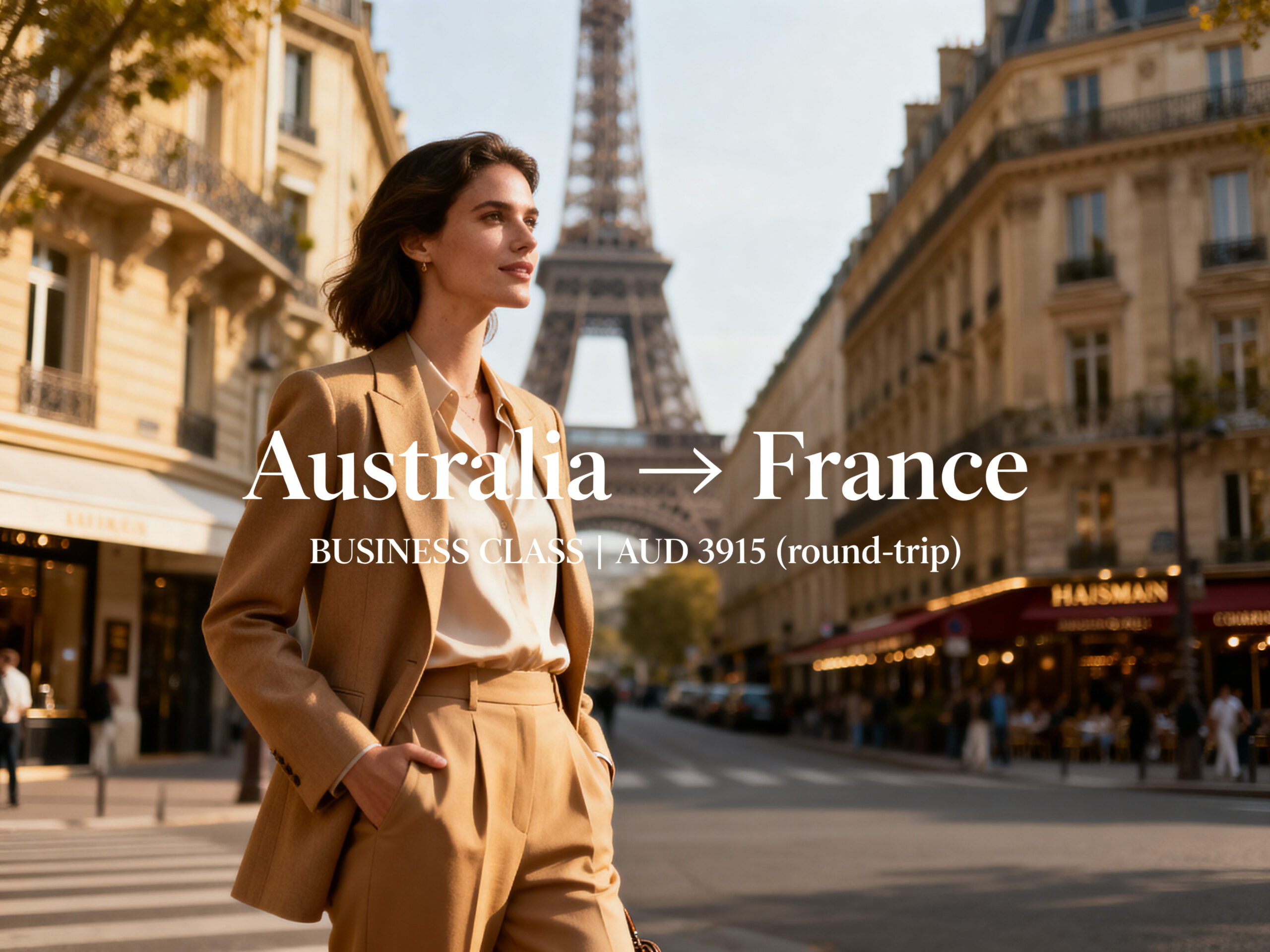 In BUSINESS CLASS from Australia to France for just A$ 3,915 (round-trip)