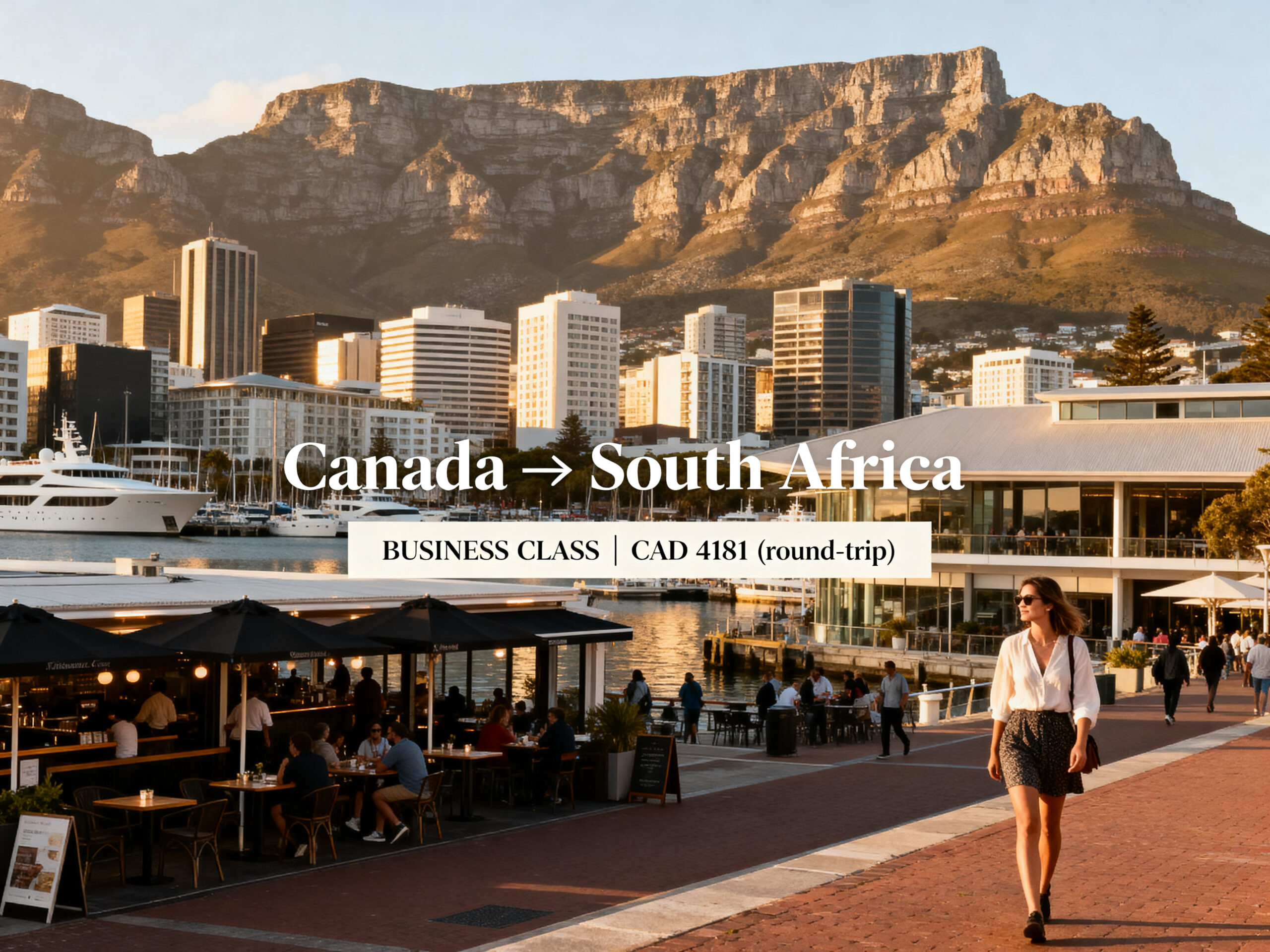 We found BUSINESS CLASS fares from Canada to South Africa starting from only CA$4,181 (round-trip), about 35% off the usual price!