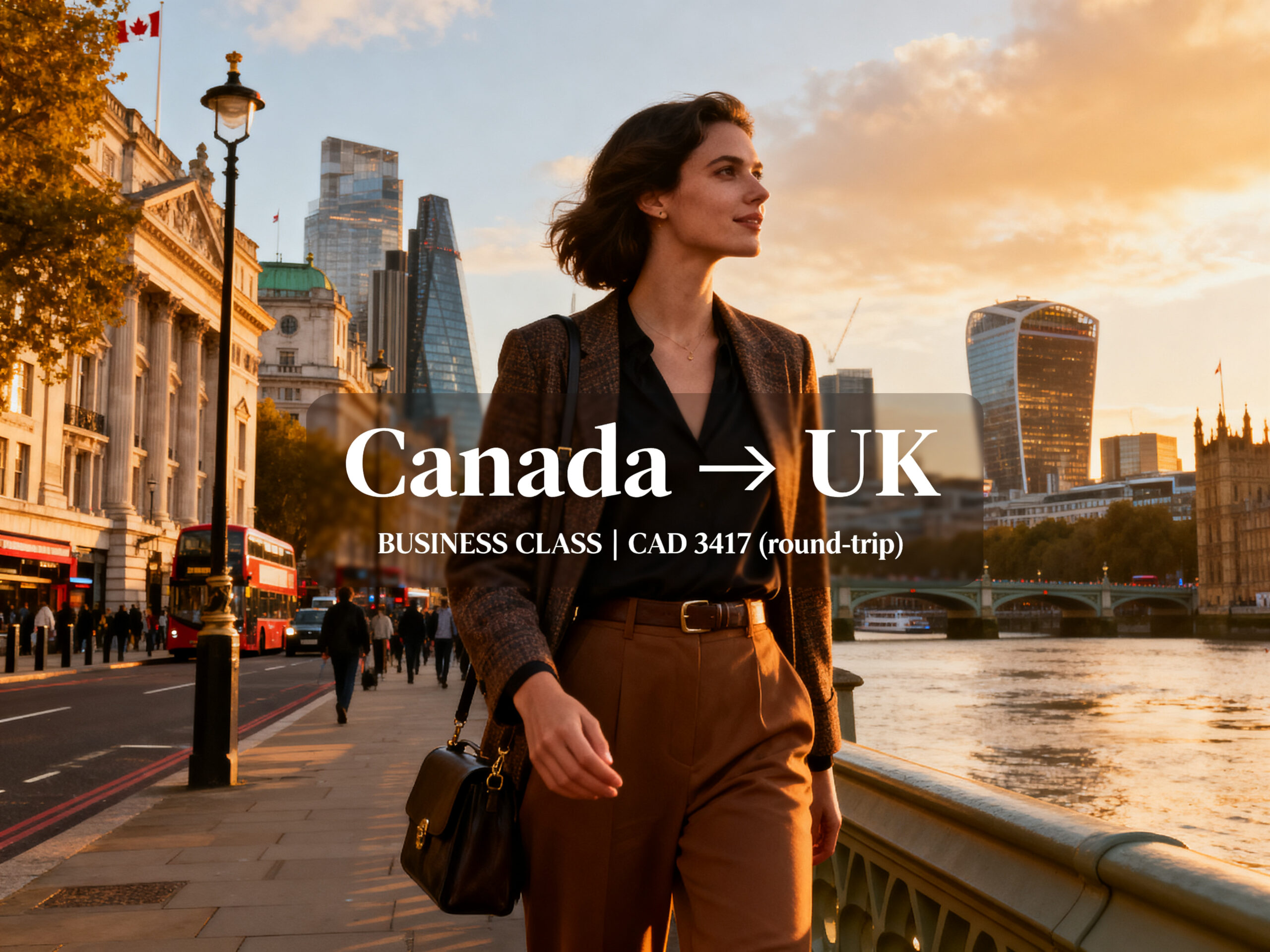 We found some cheap Business Class flights from Canada to UK from CA$ 3,417 (round-trip).