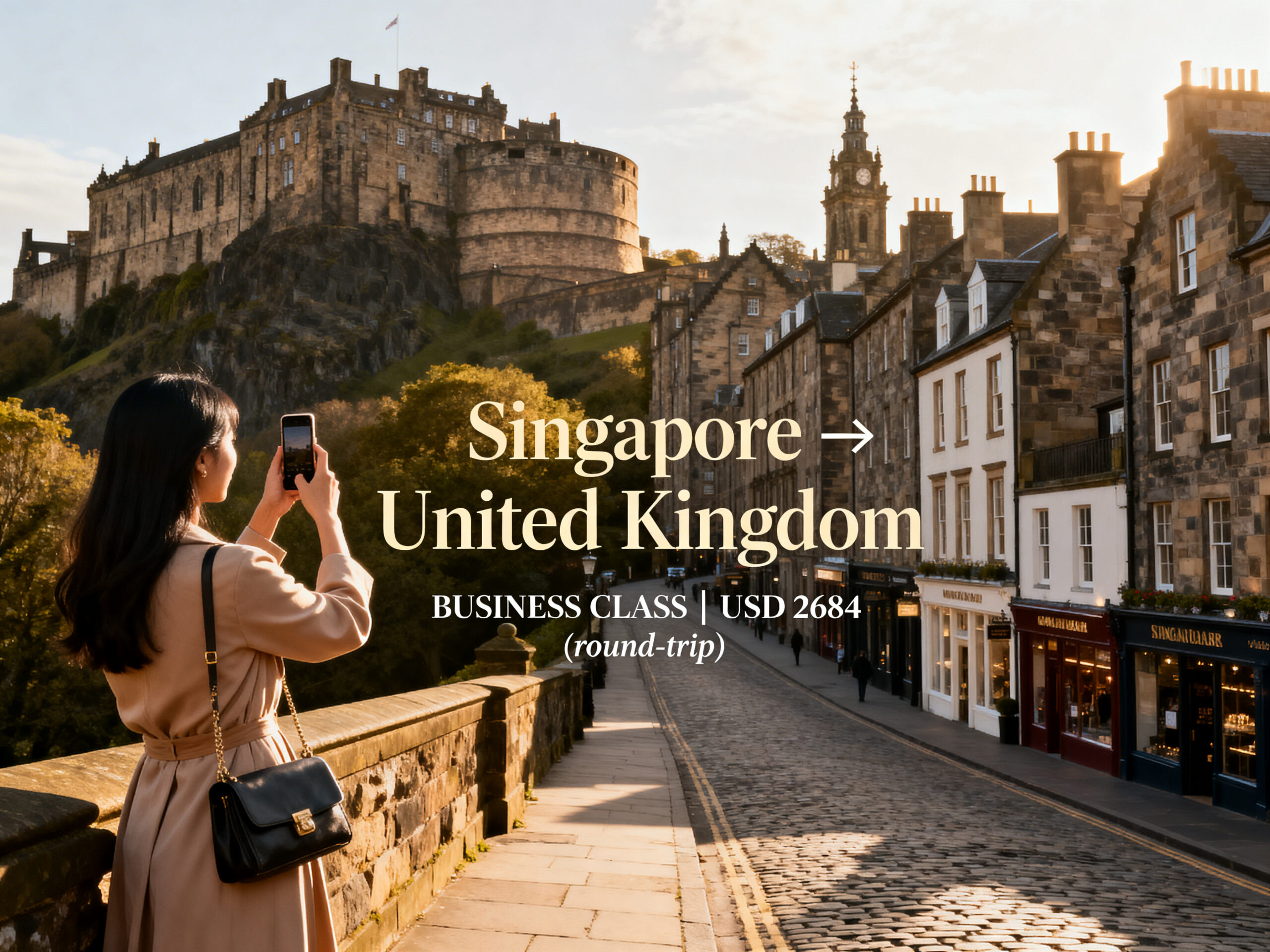 We found discounted BUSINESS CLASS fares from Singapore to Scotland, UK starting from only US$2,684 (round-trip), about 40% off the usual price!