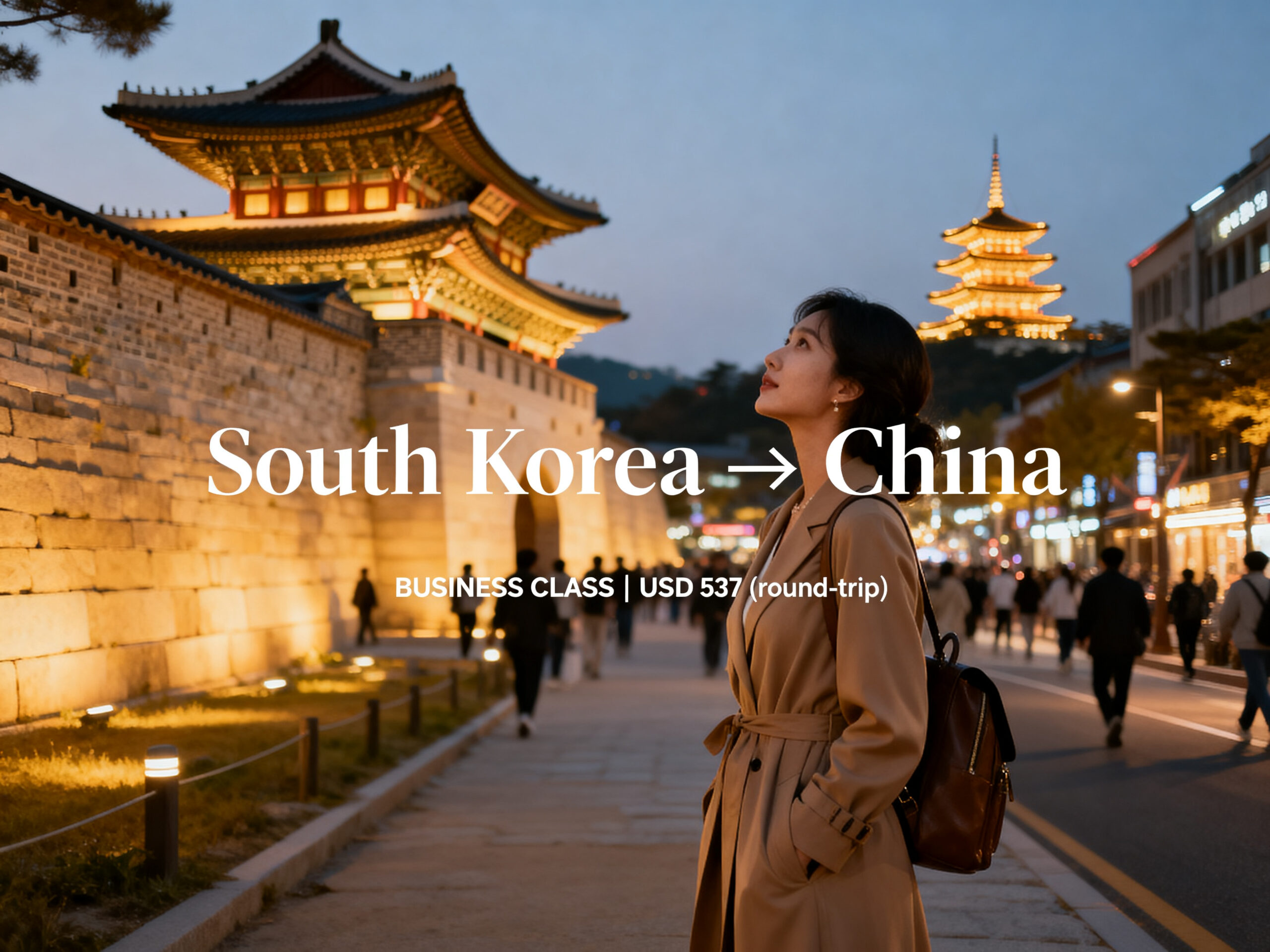 SALE! In nonstop BUSINESS CLASS from South Korea to China starting from USD $537 (round trip)