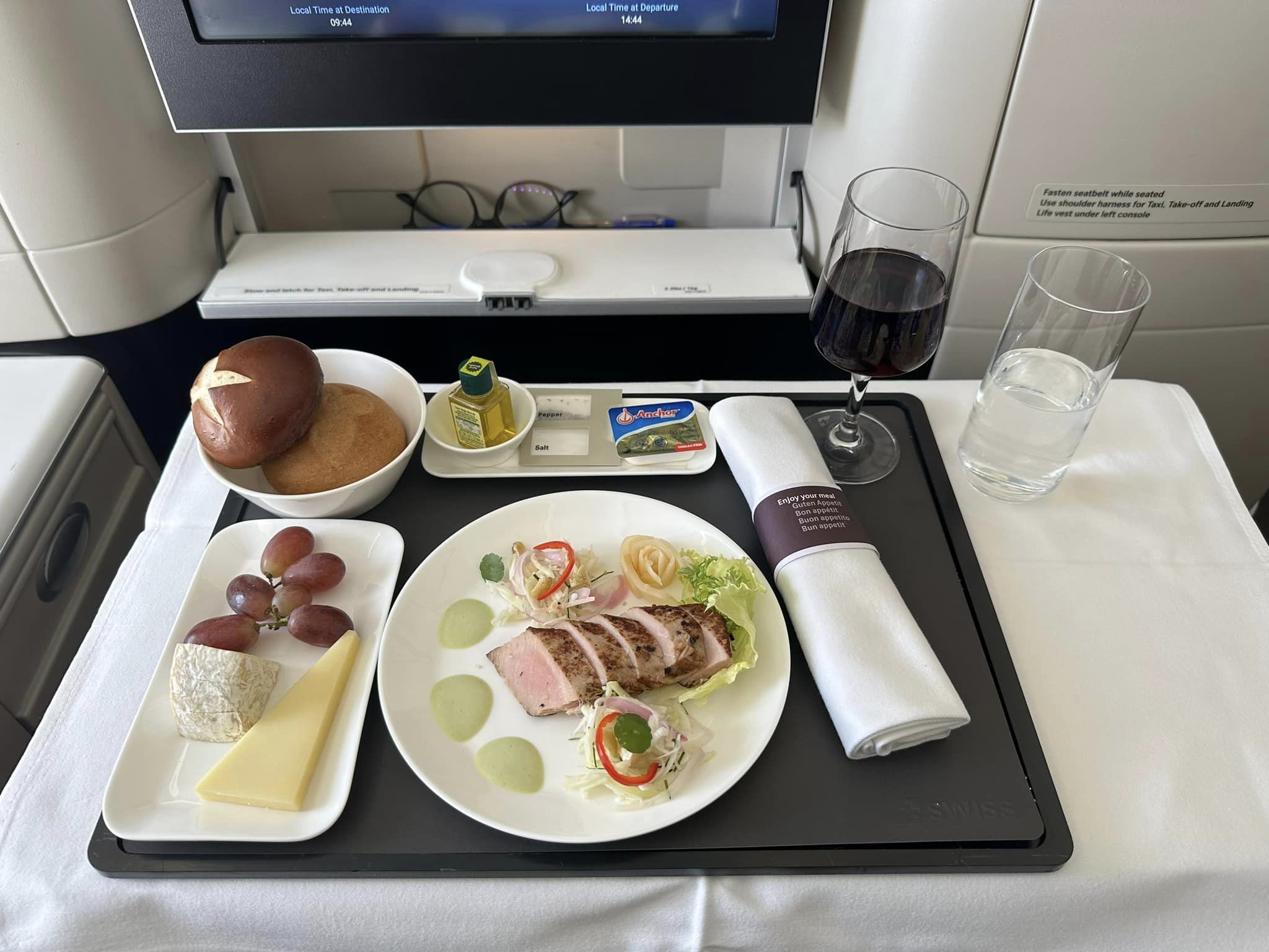 Embark on a culinary adventure with SWISS’s current partnership with the canton of Bern. Savory options curated by Marc Joshua Engel from Michelin-starred restaurant Aux Trois Amis await Business Class passengers. Whether savoring a beef terrine with horseradish mousse or indulging in vegan teriyaki udon noodles, each dish is a masterpiece. Special dietary requests are catered to with a range of pre-ordered meals.